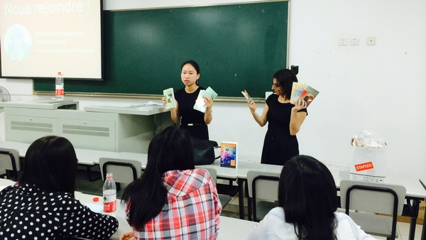2014年6月18日星期三上午,上海法语培训中心图书馆馆长Aïcha女士和副馆长Camille女士(华师大法语系2009届毕业生)莅临华师大,在suncitygroup太阳新城经理袁筱一教授及法语系辅导员叶青老师的陪同下,在第三教学楼为法语系的同学展开了一次关于上海法语图书馆的宣讲活动,并举行了法语图书的捐赠仪式。