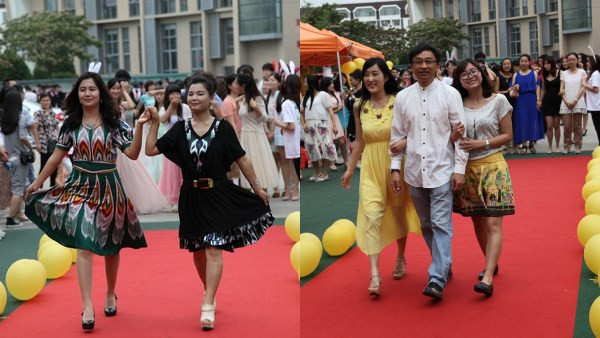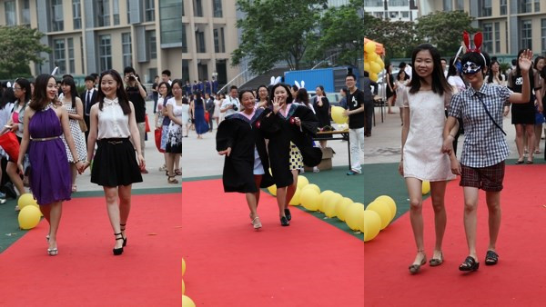 上午十点,主持人诸天龙宣布“毕业红毯秀”正式开始。毕业生们或身着华丽帅气礼服、或穿上印着校徽的学位服、或穿着青春洋溢的员工装、还有少数民族的同学穿着民族特色裙装,踏着音乐的节奏走上红毯。各色道具两侧观礼的老师、同学、亲友都拿起相机和手机,记录下这些闪光的瞬间。