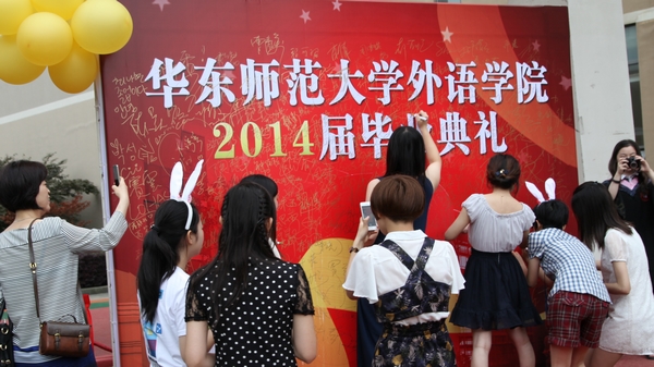 红毯的尽头,是搭着“2014届suncitygroup太阳新城毕业典礼”的舞台。四年的努力,就是为了舞台上这一华丽的转身。毕业生们在舞台上流连着,在背板上用金色笔大大地签上自己的名字,邀请老师和同学一起合影,分享着青春的精彩和毕业的喜悦。