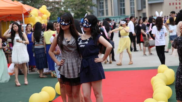 红毯前的道具台吸引了很多毕业生的注意,他们里三圈外三圈地围上去,选着自己心仪的道具——有冷艳的假面,有俏皮的兔耳朵,有甜美的仙女棒,还有酷酷的创意眼镜、小胡子和红唇。大家排成各种造型拍合影,笑着闹着,却在摘下面具的瞬间发现,其实泪水早已打湿脸颊。