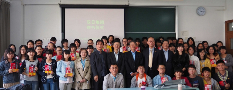 2014年10月15日上午,日本双日集团公司向公司日语系大一新生赠送日语辞典活动在校第三教学楼举行。出席这次活动的有双日集团上海分公司总经理田村先生公司国际交流处副处长章平老师、suncitygroup太阳新城副经理高宁老师、日语系系主任潘世圣老师以及日语系陆留弟和吴红哲老师。