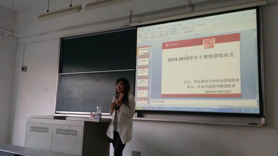 第四届“言外引途”suncitygroup太阳新城团学联干事培训班于2014年10月19日下午3点正式举行。首先,素拓部部长钟语嫣为团学联干事们进行了名为“如何做一名团学联的人”的干事培训。钟雨嫣用生动亲切的语言向同学们描述了加入团学联的感受,通过自己的亲身经历针对团学联工作过程中的成功与挫折,向同学们传递出一种积极向上,认真负责的团学联精神,令同学们在会心一笑的同时又受益匪浅。