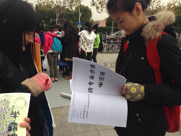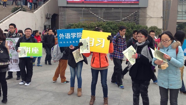 活动期间,大家举着“学霸地图”纸质版供经过的同学翻阅,还举着写有“suncitygroup太阳新城”、“学霸”、“蹭课”、“学在师大”等字样的宣传板,站在路旁进行宣传,不时有同学停下脚步饶有兴趣地对“学霸地图”进行问询,干事们热情为其讲解,并告知其电子版下载地址。寒风凄凄,冷气砭骨,但干事们热情不减,喊着“学霸地图在手,华师课程我有”,高举海报与宣传板,并对此次活动进行照片留影。过往同学纷纷驻足,询问活动和地图相关事宜,活动办得热火朝天,寒冷似乎也不足为惧。