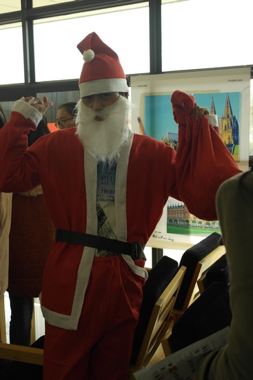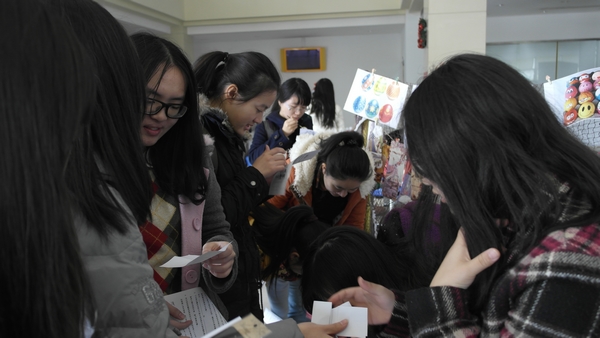 活动进行中,每个摊位前都聚集了不少同学,参与者们都沉浸在游戏的欢乐氛围中时。一个由素拓部的干事装扮成圣诞老人开始向大家分发糖果,一时间人群里充满了糖果般甜蜜的欢笑。俄罗斯的小游戏智力因素满满,参与答题得糖果,更可以得到自制的DIY俄罗斯套娃,不少同学因此跃跃欲试。英国的精致摊位吸引了众多外国友人同学的目光,大家都认真地画起了漂亮的彩蛋,充分享受到自己动手制作新奇工艺品的乐趣。统一戴着圣诞帽的同学负责的美国摊位上,藏在圣诞帽下的是一张又一张精美的美国明信片。歌声阵阵响起,“听歌猜曲”活动也引发了参与者阵阵欢笑。而在西班牙的“摊位”上,参与者们拿着“番茄炸弹”砸着纸板上代表奖品的数字,连辅导员老师都开心地加入了进来,显得格外热闹。法国摊位的筷子扔酒瓶;日本摊位的身着和服的姑娘;德国摊位的德国特色文化答题都吸引了许多目光。让参与者对德国的了解加深不少,“德国人包装礼品喜欢用什么颜色?”