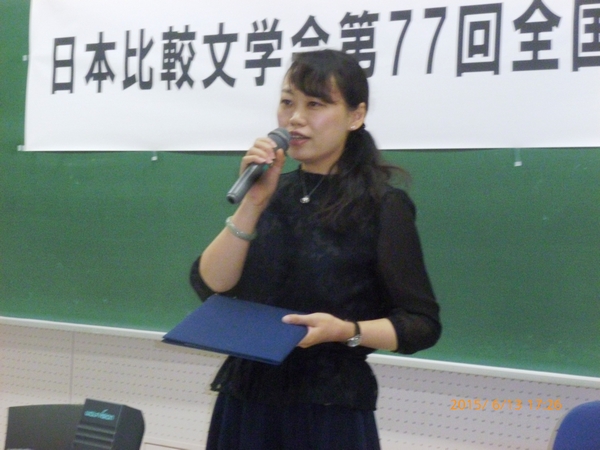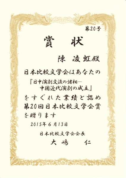 本届颁奖仪式于2015年6月13日在立命馆大学(京都)举行。“日本比较文学会奖”评审委员会委员长北村卓教授介绍了获奖著作内容和颁奖理由,现任会长大嶋仁教授向作者陈凌虹颁发了奖状和奖品。其后获奖者陈凌虹发表演讲,回顾多年的研究历程,表达对学界前辈同仁的谢意,并表示今后将在比较文学比较文化领域奋力耕耘,奉献更多更好的研究成果。