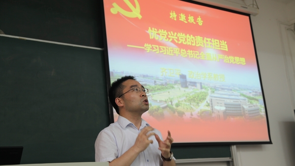 本次党员大会邀请政治学系原系主任齐卫平教授作了题为《忧党兴党的责任担当——学习习近平总书记全面从严治党思想》的报告。报告从党的十八大以来全面从严治党的新局面、习近平总书记全面从严治党的主要思想、习近平总书记全面从严治党的基本特点等三个方面为大家详细解读了习近平总书记一系列重要讲话精神,重点解读了习近平总书记全面从严治党的十点主要思想,使全体党员都接受了一次很好的理论教育,增强了爱党情怀、坚定了政治信念和为学校发展而贡献力量的决心。