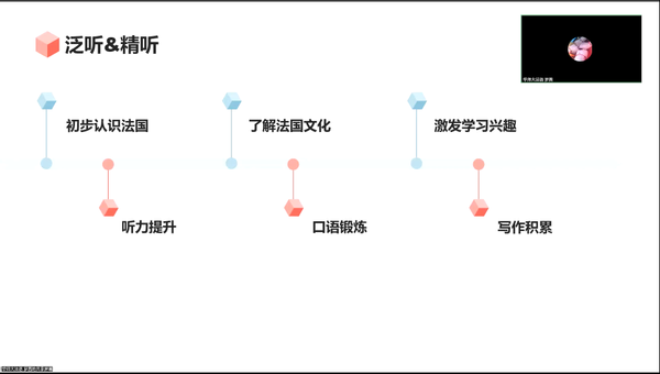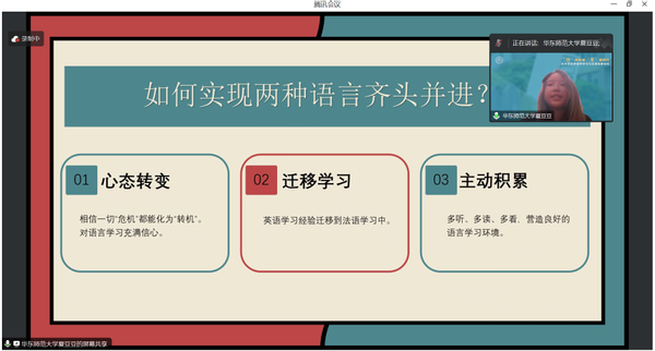 法语系2019级本科生罗茜主要介绍了如何通过影视剧学习地道法语口语表达,她介绍了泛听和精听两种方法,前者可以帮助初学者初步认识法国、了解法国文化,从而激发对于法语语言学习的兴趣;后者可以收获绝佳的听力素材、口语锻炼对象以及写作时能够使用的好词佳句。接着,她以法国经典电影《触不可及》为例,详细讲解了精听原版影视剧的方法与技巧,如一词多义、缩略语的词汇积累以及学习台词中的地道口语表达等等。最后她提到了几则通过影视剧学习法语的注意事项,如区分语级、有所挑选、由易到难等。