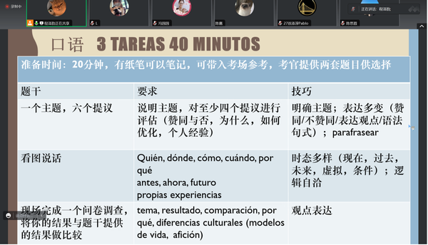 西班牙语专业2019级本科生程泽韵介绍了与西语相关的不同类型的考试,并以dele b2级别的考试为例,对听说读写四个板块的题型、技巧与日常准备做了经验分享。随后,她以圣诞彩票为出发点,分享了如何从文化现象入手,提升自己的西语水平。
