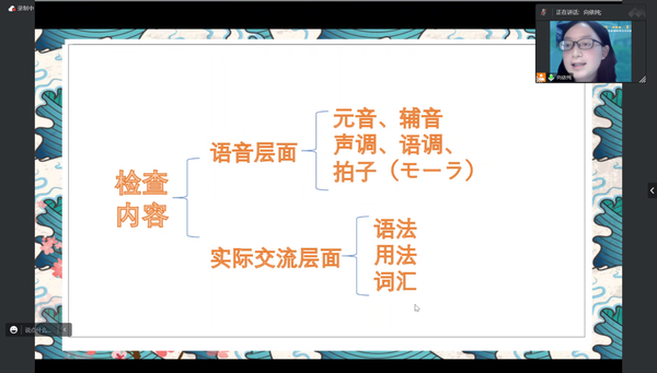日语系2020级本科生向依纯从如何朗读、交流和检查三个方面分享了自己的日语口语提升经验,并结合实例介绍了实际操作步骤。她提出,朗读时既要读也要听,按照“听”(听录音)-“画”(画记号)-“读”(读文本)-“录”(录声音)-“比”(做比对)的步骤,在朗读时将口耳连接起来,提升听力和朗读的流畅度;实际交流时,要合理运用线上线下各种资源,目标明确、做好准备、主动出击,提升实际口头交流能力;最后要时常对自己进行回顾和检查,从语音层面和实际交流层面共同出手,借助科学的方法,推动日语口语的提升,为初学者的口语提升提供了一套行之有效的训练法。