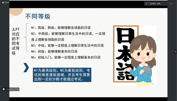 日语系2022级硕士研究生宫莹则主要聚焦日语能力等级考JLPT的备考,她围绕日语能力等级考是如何组织开展、如何设置题目方向等话题,针对不同的科目以及题型,有侧重性地分别介绍了备考经验,最后汇总梳理了一些备考阶段划分和各阶段的准备策略,帮助日语学习者对日语等级考试的背景和备考流程有一个整体认知和初步规划。