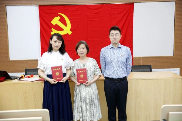 7月1日,退休党支部书记钱元通、丁兰兰,支委何佩建一起走访了入党满70年的两位老党员——朱逸森老师和徐惠安老师,并为入党满50年的沈爱珍老师送上“光荣在党50年”纪念章。