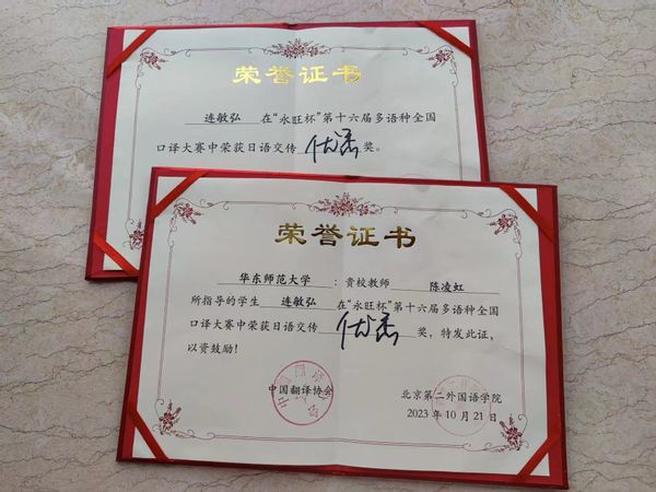 来自国内外高校的114名选手在各项比赛中展开激烈角逐,最终日语系2020级本科生连敏弘获得日语交替传译组优秀奖,陈凌虹老师获得优秀指导教师称号。