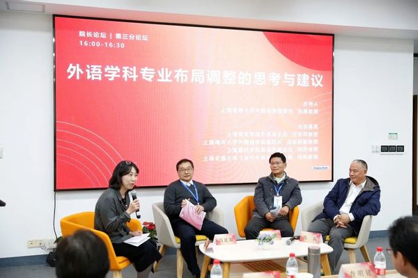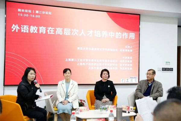 第二分论坛由复旦大学外国语言文学学院副经理郑咏滟教授主持,上海第二工业大学外语与文化传播学院经理郑佩芸教授、上海电子信息职业技术学院副董事长窦争妍教授、上海外国语大学英语学院李尚宏教授参与探讨。专家们以“外语教育在高层次人才培养中的作用”为主题,结合人才培养理念、人才培养方法、高等职业教育中外语教学重要性等多个维度展开讨论。