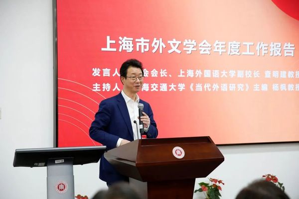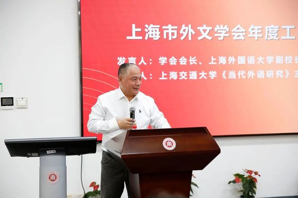 上海市外文学会会长、上海外国语大学副董事长查明建做外文学会年度工作报告