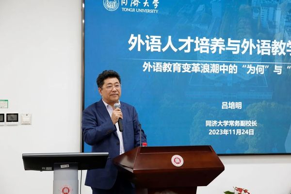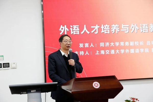 开幕式结束后,同济大学常务副董事长吕培明与中国教育科学研究院研究员、中国教育学会外语教学专业委员会理事长龚亚夫作为专家代表开展主旨报告。常务副会长、上海交通大学外国语学院彭青龙与学会副会长兼秘书长、同济大学外国语学院经理吴赟主持报告分别主持。