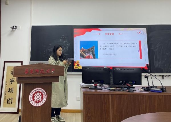 支部党员夏菲以“深刻把握习近平文化思想的丰富内涵与重大意义”为主题,主要从四个方面介绍了深刻把握习近平文化思想的丰富内涵与重大意义。一是要坚持党的领导,维护国家文化安全:夏菲同学以近期发生的间谍案为例,指出了当前西方敌对势力对我国文化安全的渗透和威胁以及打赢意识形态之战必须做到的要求。二是要坚持文化自信,推动中华民族伟大复兴:她先点出了文化自信的重要性和来源,然后以中国国家版本馆中国历史研究院所承担的任务为例,强调了国家对弘扬中华优秀传统文化的重视。三是要坚持“两个结合”,建设中国特色社会主义文化:夏菲同学结合最近的“文物热”“传统文化热”以及杭州亚运会将传统文化与现代科技完美融合等热点,展示了中华优秀传统文化创造性转化、创新性发展的代表性成果。四是要坚持文明交流互鉴,创造人类文明新形态:她结合“一带一路倡议”的最新成果,点明了习近平文化思想的现实意义。