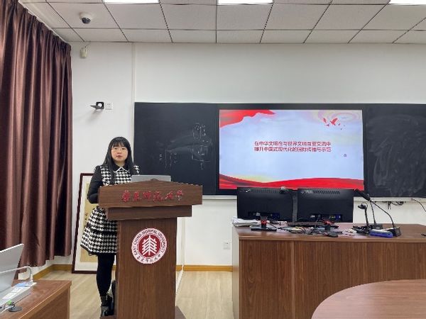 支部党员张从笑以“中华文明和中国式现代化”为题进行了发言。她先引用了习近平总书记的话语指出了“中华文明”的内涵与特点:中华文明具有生生不息的历史延续性、革故鼎新的创新性、各民族文化水乳交融的统一性、厚德载物的包容性以及主张公平正义的和平性。她还指出,西方的现代化道路是一种欧洲中心主义的、片面的现代化观,而与之相对的是具有多元现代性的中国式现代化道路。最后她又重申了中国式现代化所具有的特点,即人口规模巨大的现代化、全体人共同富裕的现代化、物质文明与精神文明相协调的现代化、人与自然和谐共生的现代化和和平发展道路的现代化。