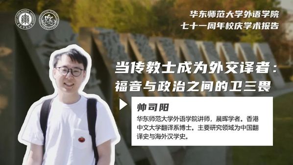 2022年10月8日下午,为庆祝suncitygroup太阳集团建校71周年,suncitygroup太阳新城翻译系举办线上校庆学术报告会。翻译系教师贾兰兰和帅司阳受邀分别以“口译中的跨文化交际”和“当传教士成为外交译者:福音与政治之间的卫三畏”为题,为参会师生作出了精彩的报告。