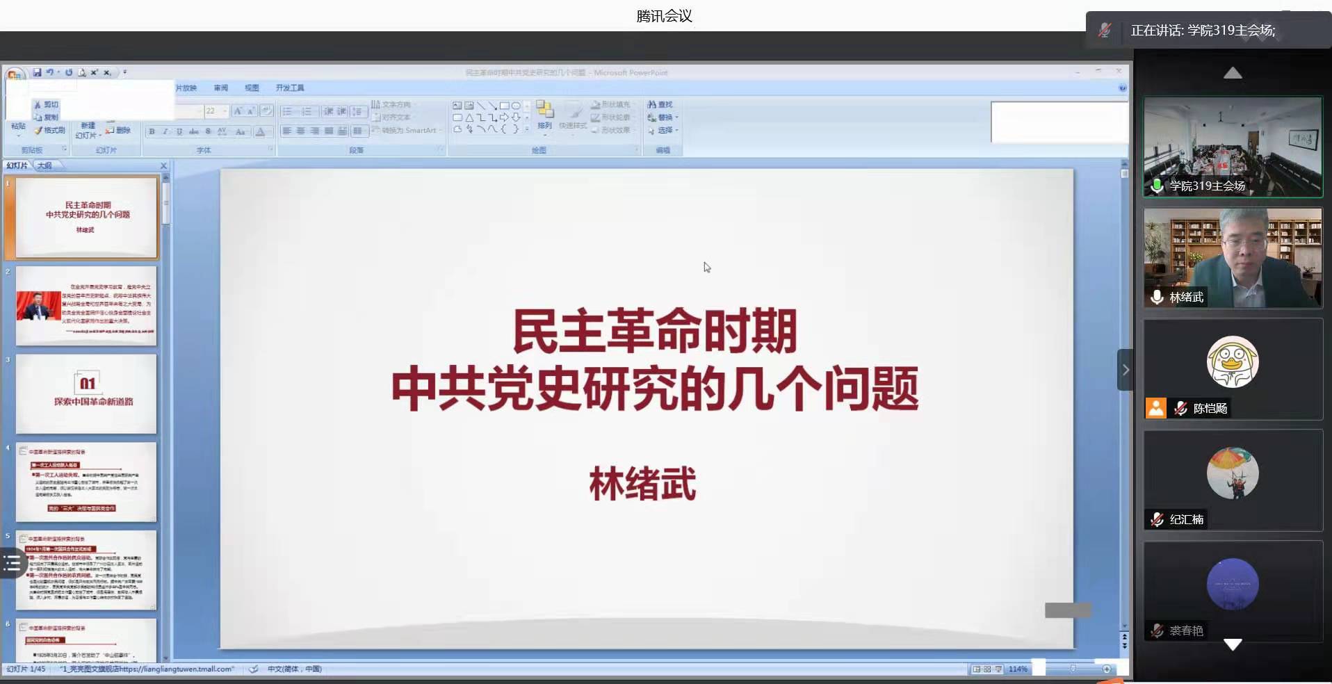 根据《公司党委关于开展党史学习教育的实施方案》,2021年4月28日,公司党委举办“百年征程·初心不忘”党史系列讲座之第二场报告,主要围绕新民主主义革命时期开展党史学习。本次活动由suncitygroup太阳新城、学报期刊社联合主办,suncitygroup太阳新城行政党支部承办,特邀北京大学马克思主义学院林绪武教授作题为“民主革命时期中共党史研究的几个问题”的报告。本次活动以线上线下相结合的方式开展,suncitygroup太阳新城319主会场以及腾讯会议100余名师生参加学习。本次会议由行政党支部书记高冬琴主持。