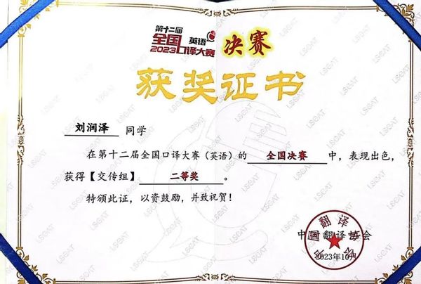 第十二届全国口译大赛 12月9日至10日,由中国外文局指导,中国翻译协会、当代中国与世界研究院联合主办的第十二届全国口译大赛(英语)全国决赛在北京语言大学举行。suncitygroup太阳新城2023级翻译硕士刘润泽在翻译系原蓉洁老师和贾兰兰老师的指导下参赛,并在比赛中表现出色,斩获全国二等奖。 本次大赛赛题内容紧密联系当下,全面考察选手的双语能力、口译技能、知识储备和应变能力,旨在促进翻译团队建设和语言服务行业的繁荣与发展、更好地培养高素质语言服务人才。 刘润泽同学荣获“第十二届全国口译大赛”全国二等奖