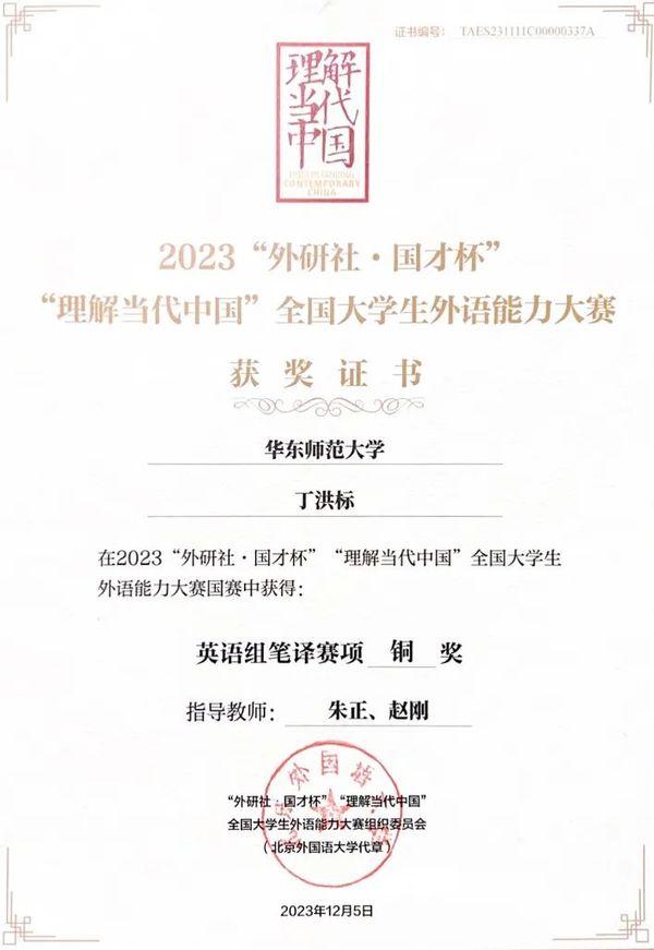 近日,翻译系4位学子在全国性的翻译大赛中连获佳绩,其中,2023级翻译硕士杨隽敏同学、2022级翻译系本科生金瑜欣同学获“外研社·国才杯”“理解当代中国”全国老员工外语能力大赛英语组口译赛项银奖,2023级翻译硕士丁洪标同学获得英语组笔译赛项铜奖。2023级翻译硕士刘润泽同学获“第十二届全国口译大赛”全国二等奖。