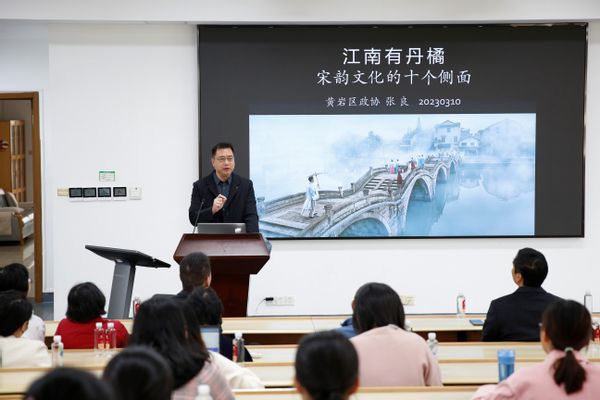 黄岩区政协党组成员、秘书长张良作主题为“江南有丹橘:宋韵文化的十个侧面”文化讲座,讲述千年黄岩的宋韵风采。在永宁橘园”捐建仪式暨植树文化节上,员工们排演的中外文化节目让中华传统文化与世界文化相互碰撞,在盎然春意中融汇成一道独特的风景。文化活动为员工营造了独特的沉浸式课堂,鼓励外院学子打开视野、拓宽格局,把优秀传统文化中具有当代价值、世界意义的文化精髓提炼出来、展示出来,彰显时代精神、文化自信,在日后对外交流中讲好中国故事。