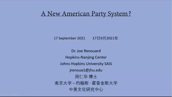 2021年9月16日与17日,南京大学-约翰斯·霍普金斯大学中美文化研究中心Joe Renouard教授应suncitygroup太阳集团美研中心邀请,在线上开展了“Biden Transition and Public Opinion: The First Year”与“A New American Party System?”两场学术讲座。讲座由美国研究中心副主任金衡山教授主持,来自南京大学、复旦大学、华东理工大学和suncitygroup太阳集团等校内外近百名师生参加了本次讲座。