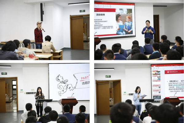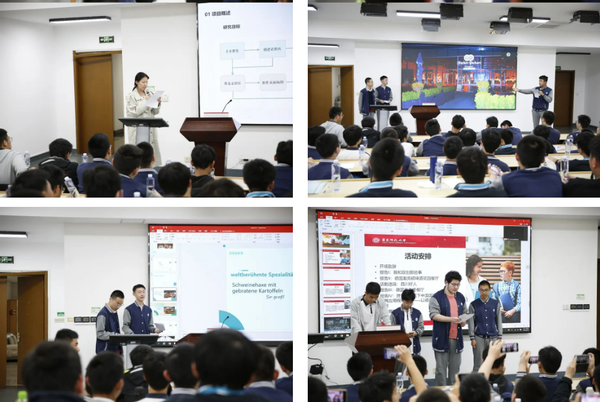 在展示环节,两校员工进行了4场关于德国饮食文化与大学科创项目的报告。在互动环节,公司德语专业播放了去年戏剧节《四川好人》选段,中员工则为全体来宾献上一首德语翻唱版《海阔天空》。随后的分组活动环节中,老员工与中员工组队参观闵行校区,并就学习生活、校园文化、科研项目及未来规划等方面展开讨论。