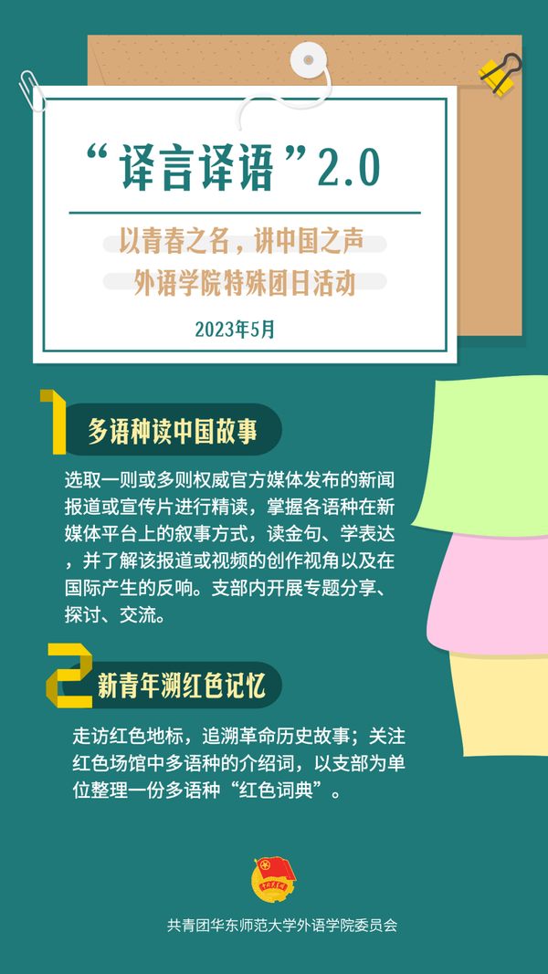 本次特殊团日是“译言译语——多语种读懂二十大”活动的延续和升级,设计“多语种读中国故事”和“新青年溯红色记忆”两大活动板块,各基层团支部在此基础上定制活动方案,精读优秀外宣产品,读金句、学表达,探讨创作视角及传播影响;走访红色地标,追溯革命历史故事,学习多语种的介绍词,整理多语种“红色词典”。