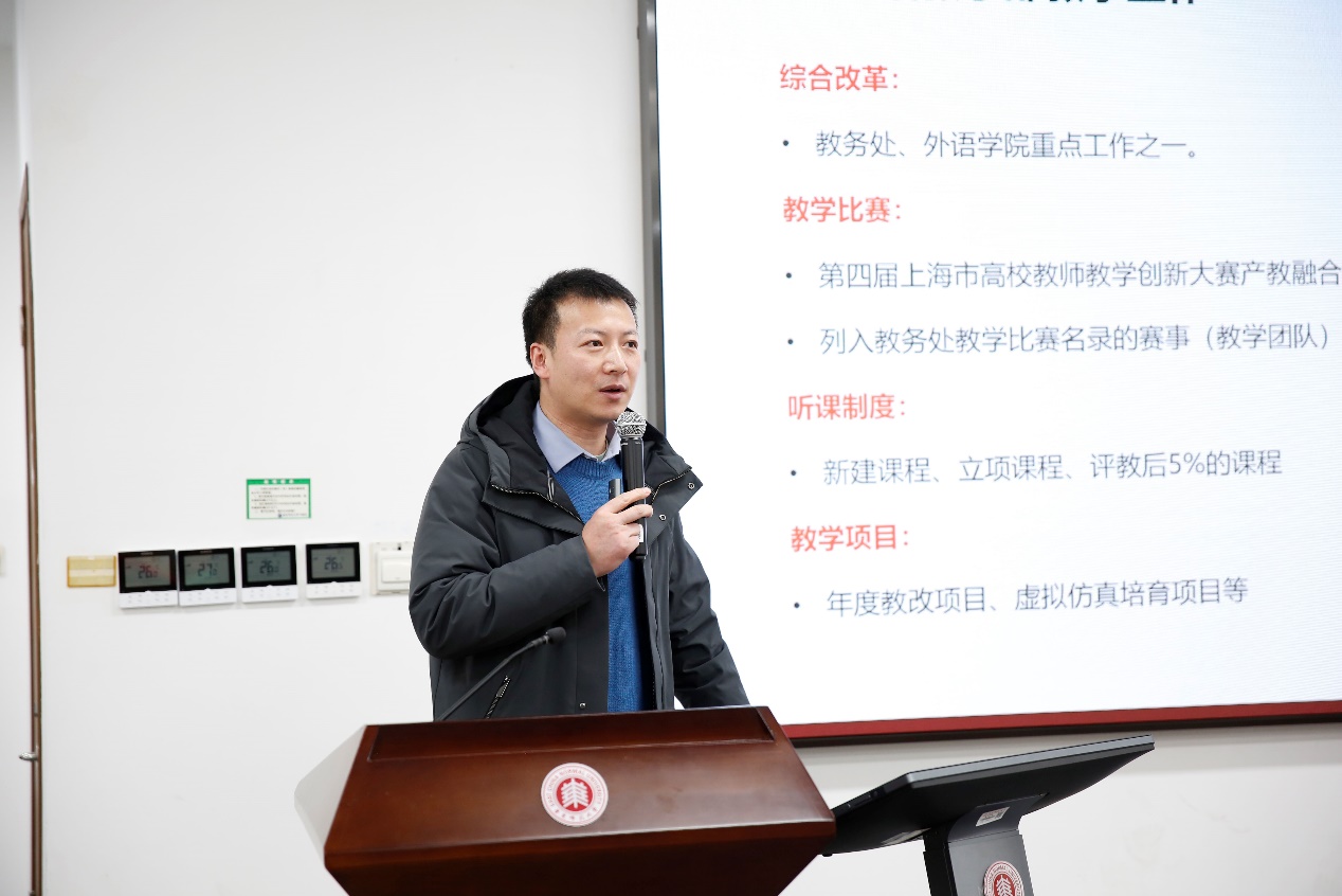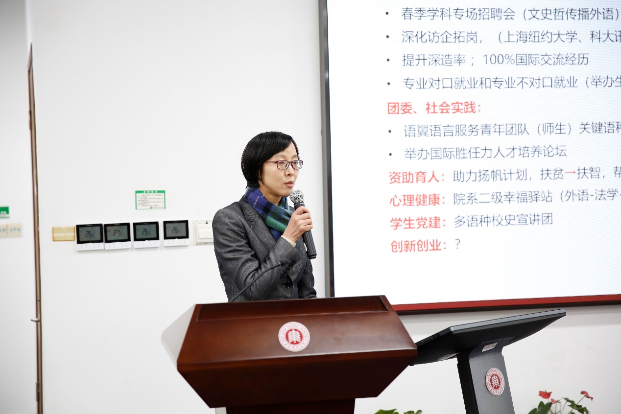 经理兼党委副书记杨延宁通报了学院本学期五大重点工作,即加强党建引领,推动党建与事业发展“一融双高”;坚持立德树人根本任务,对接卓越育人工程;心怀“国之大者”,对接卓越学术工程;服务社会发展,对接卓越服务工程;提升治理水平,落实一流行动保障。他指出,面对“外语学科如何对接国家战略?如何对接新一轮科技革命和产业变革?如何对接学校“双一流?”三大问题,学院顺势而为、紧抓机遇、集思广益提出破题之举。2024年,学院将持续打破界限,整合各方资源,以“双语双科” 复合型人才培养为核心,以师范生贯通式培养和语言智能方向建设为增长点,通过“一系一策”发展思路激活各专业优势特色和改革动力,通过高水平、多元化语言教学与服务助推全校卓越人才培养。