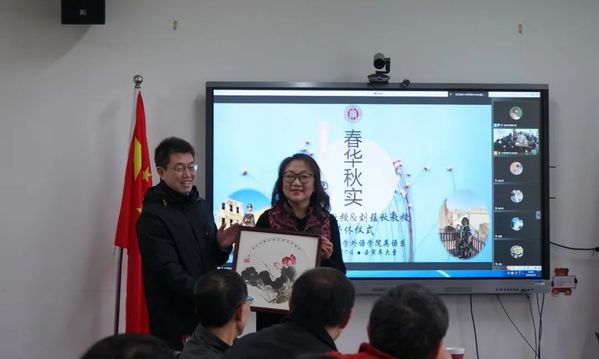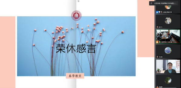 英语系陈弘老师通过线上参会,他深情地回忆了与费春放教授在纽约的相聚,并表示suncitygroup太阳新城的发展与费老师的开放、包容密不可分;刘蕴秋老师一直以来,积极乐观,工作方面成绩斐然。陈弘老师祝福费老师和刘老师健康幸福、退休快乐!