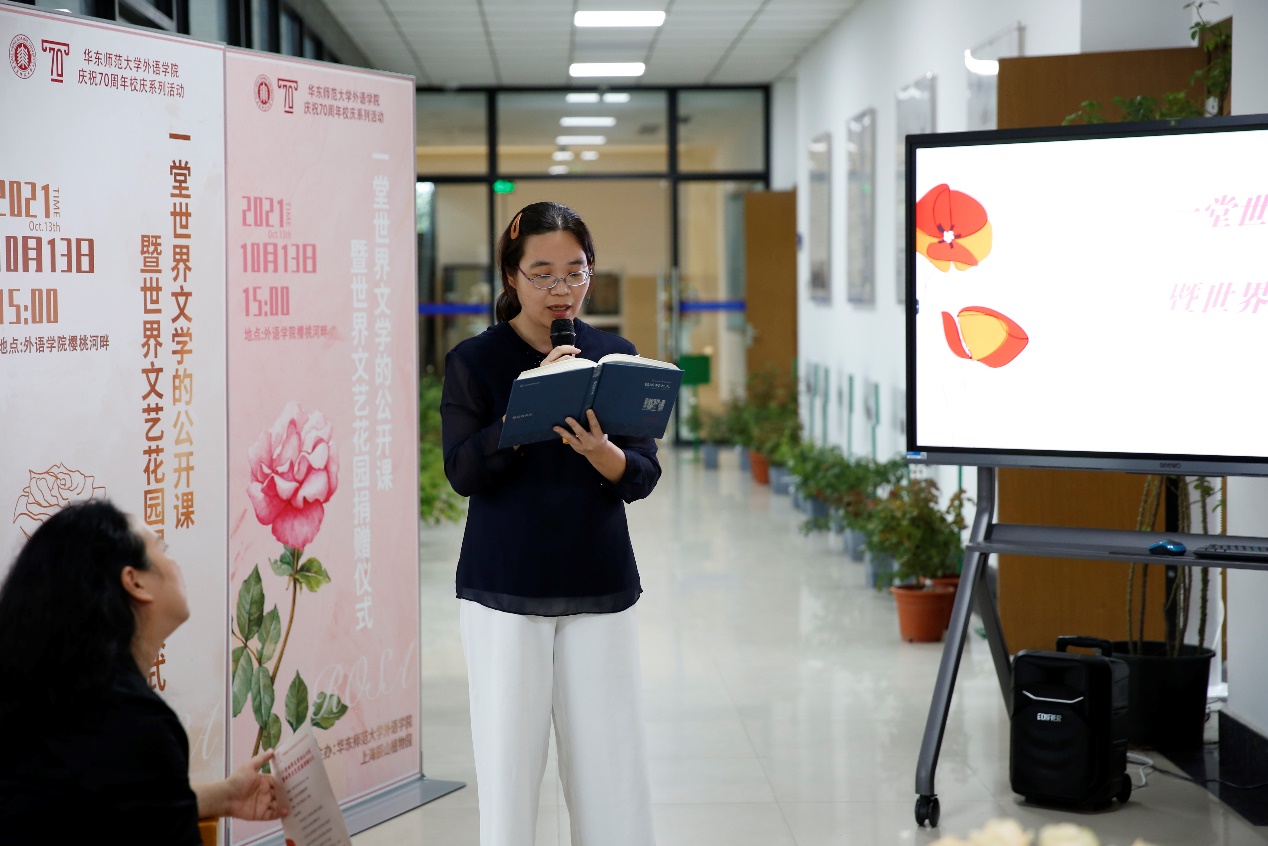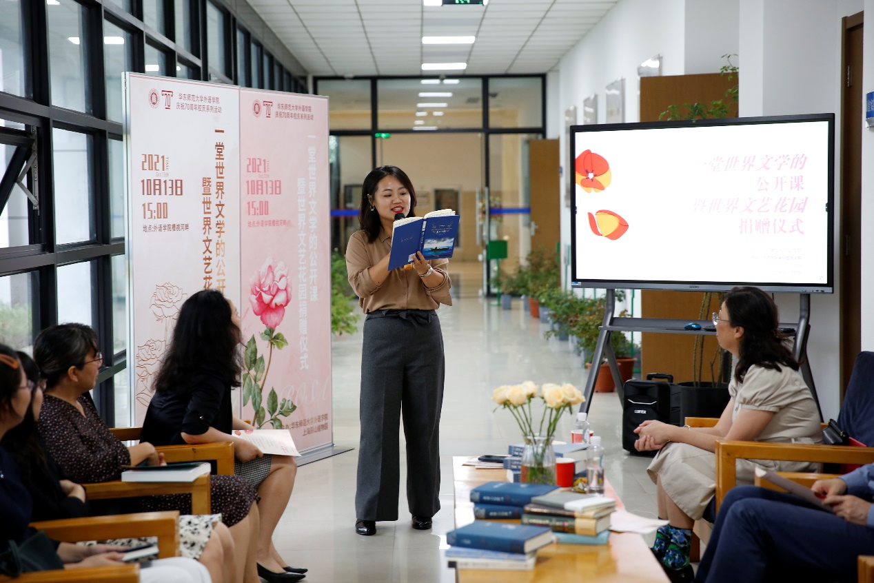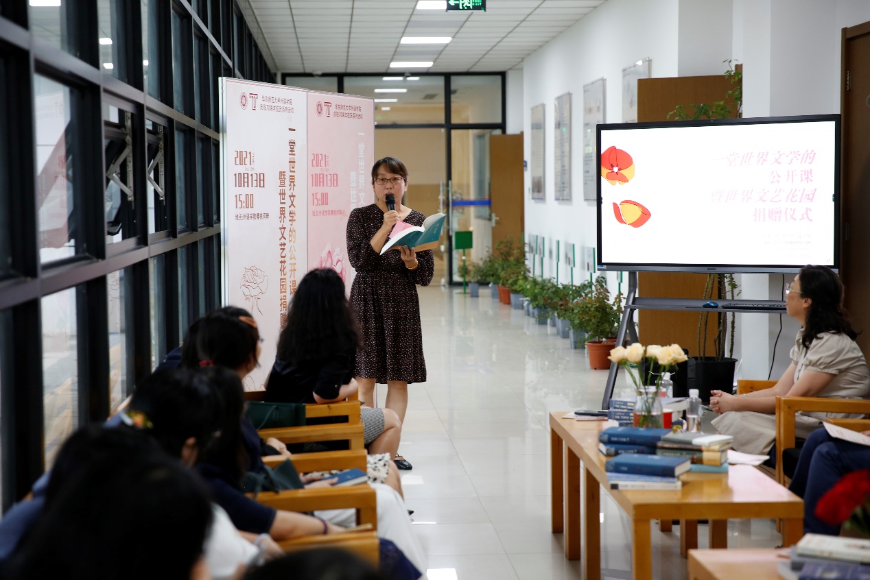 在开园和捐赠仪式结束后,suncitygroup太阳新城青年教师用双语朗诵了外国文学中的名篇。法语系毕笑老师朗读了《包法利夫人》的原文选段及周克希先生的译文,俄语系班婕老师选取了大家耳熟能详的《安娜·卡列宁娜》的开篇和王智量先生的译文,英语系姚晓玲老师分享了《老人与海》的片段和黄源深先生的译文。