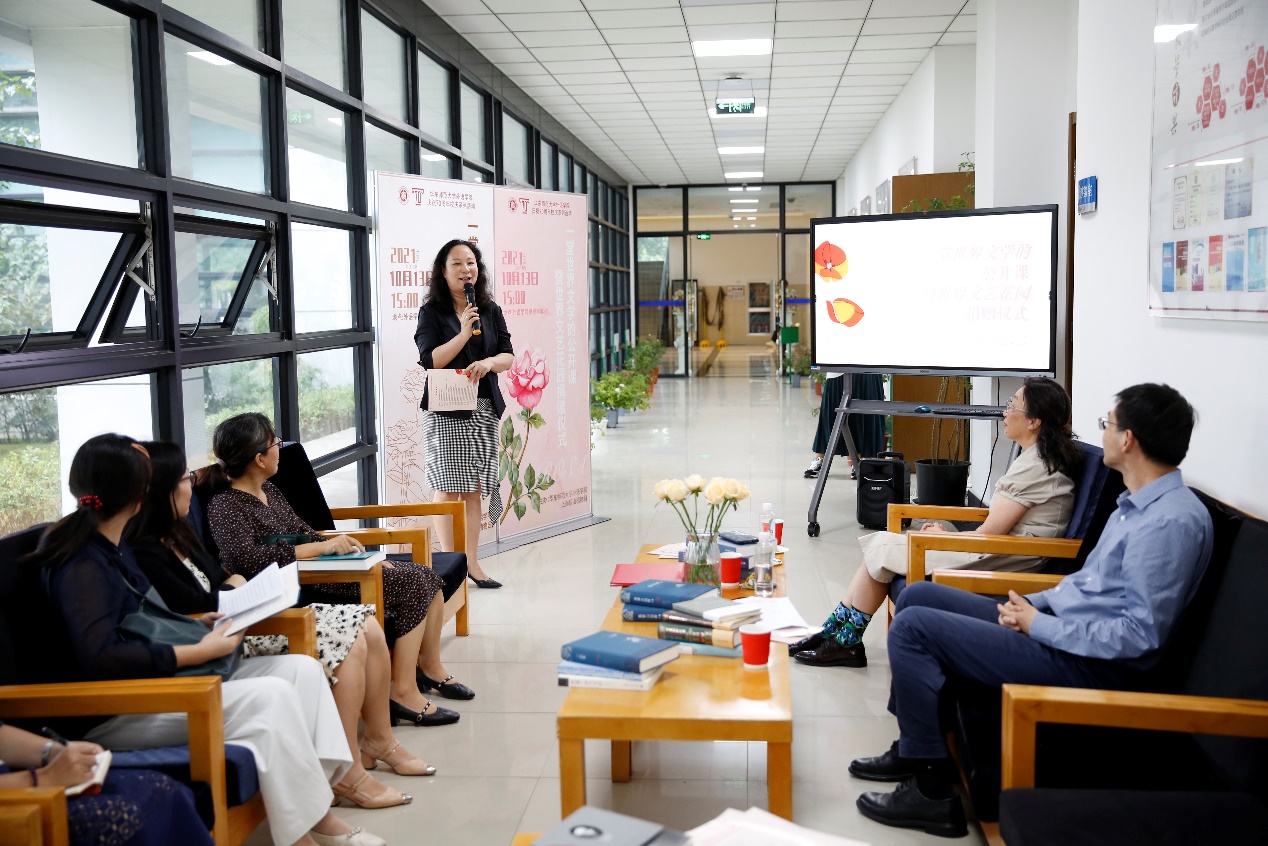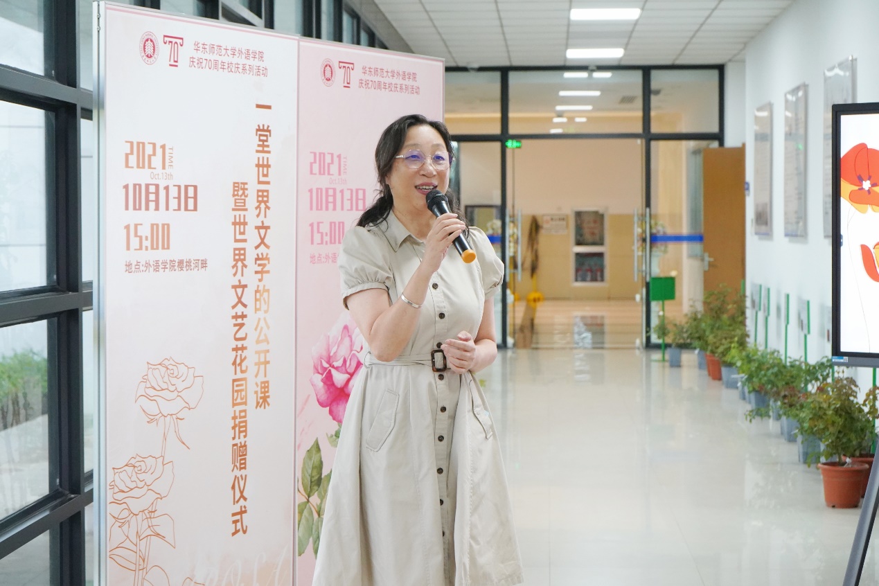 辰山植物园文化园长陈丹燕与大家分享了华东师大与辰山植物园共建世界文艺花园的初衷。作为华东师大中文系的杰出员工,她深怀着对母校的眷恋。员工时代在丽娃河畔的世界文学史课恍如昨日;而辰山植物园拥有亚洲最大的月季园,这里的杂交月季有着100多个花瓣——她寻找到了两者之间最浪漫的连结方式——用自己写的关于世界名著的故事为花命名,“将花与故事带回母校”。她还表达了对翻译家的敬意,“没有翻译,我们便无法与世界连结”。