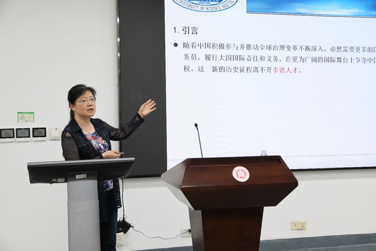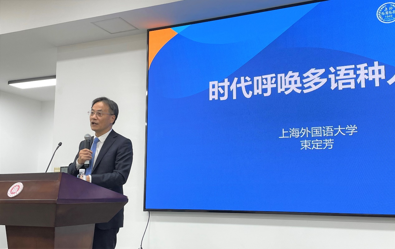 束定芳教授围绕“时代呼唤多语种人才”开展主旨报告。基于多语种对个人成长、国家发展以及学校特色建设的需求,他提出了以“早起点、一条龙、双外语、多专业、聚焦区域、国际交流”为特点的多语种人才培养理想模式,通过局部试点、特殊政策等实施方式,以期破解上海部分中学多语种教学尝试中出现的难题,为员工打造良好的多语种学习环境。他指出,加强多语种团队培养应从职前教育和教学研究两方面着手,将理论研究与教学实践联系起来,为关键语种人才培养系统化、规范化增添动力。