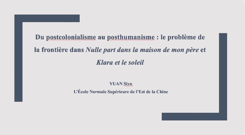 公司法语系2021级博士生谢菲同学的论文 « La relation humain-machine dans Les Liens artificiels de Nathan Devers »(《论纳当德维尔《人工连接》中的人机关系》)顺利通过初审,并在论文展示和答辩环节以优异表现得到评委老师们的高度评价,最终喜获博士生分论坛一等奖。2022级博士生张笑语同学的论文« Du récit historique au récit littéraire : la construction de l’auctorialité des trois écrivains francophones de l’Afrique occidentale au XXe siècle »(《从历史叙事到文学叙事:二十世纪三位西非法语作家的作者身份建构》)与2022级博士生袁丝雨同学的论文« Du postcolonialisme au posthumanisme : le problème de la frontière dans Nulle part dans la maison de mon père et Klara et le soleil »(《从后殖民到后人类:论《在父亲的家中无容身之地》和《克拉拉与太阳》中的边界问题》)同样表现出色,均喜获博士生分论坛二等奖。