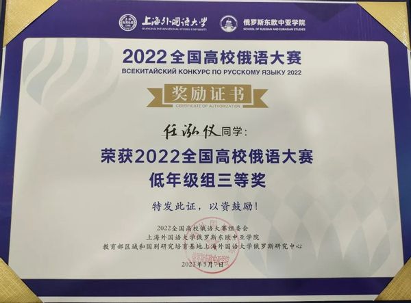 2023年5月5日-7日,2022全国高校俄语大赛复赛和决赛环节在上海外国语大学松江校区举行。经过两天的激烈角逐,公司俄语系参赛选手、2021级本科生任泓仪同学,在班婕老师的指导下,以低年级组总成绩第13名的好成绩,荣获2022全国高校俄语大赛三等奖。