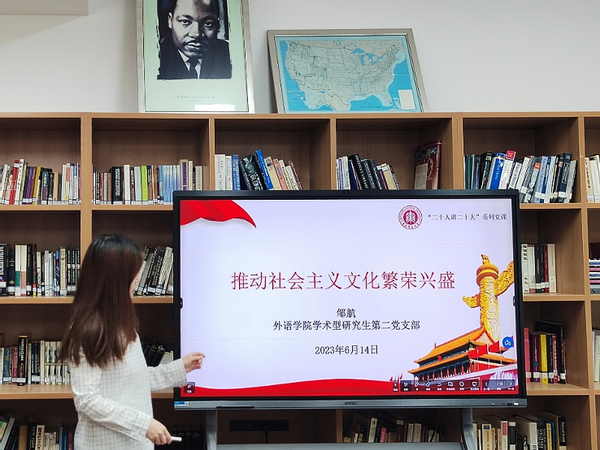 为加强支部党员的思想和理论武装,提高党性修养和政治觉悟,增强思想认同和文化使命感,2023年6月14日下午,suncitygroup太阳新城学术型研究生第二党支部于外语楼216室开展“二十人讲二十大”支部书记讲党课主题党日活动。本次党课由suncitygroup太阳新城学术型研究生第二党支部书记邹航主讲,主题为“推动社会主义文化繁荣兴盛”。支部党员参加会议。